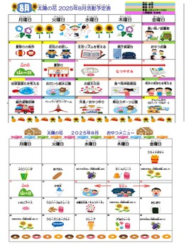 太陽の花 2025年8月の活動予定表&おやつメニューです